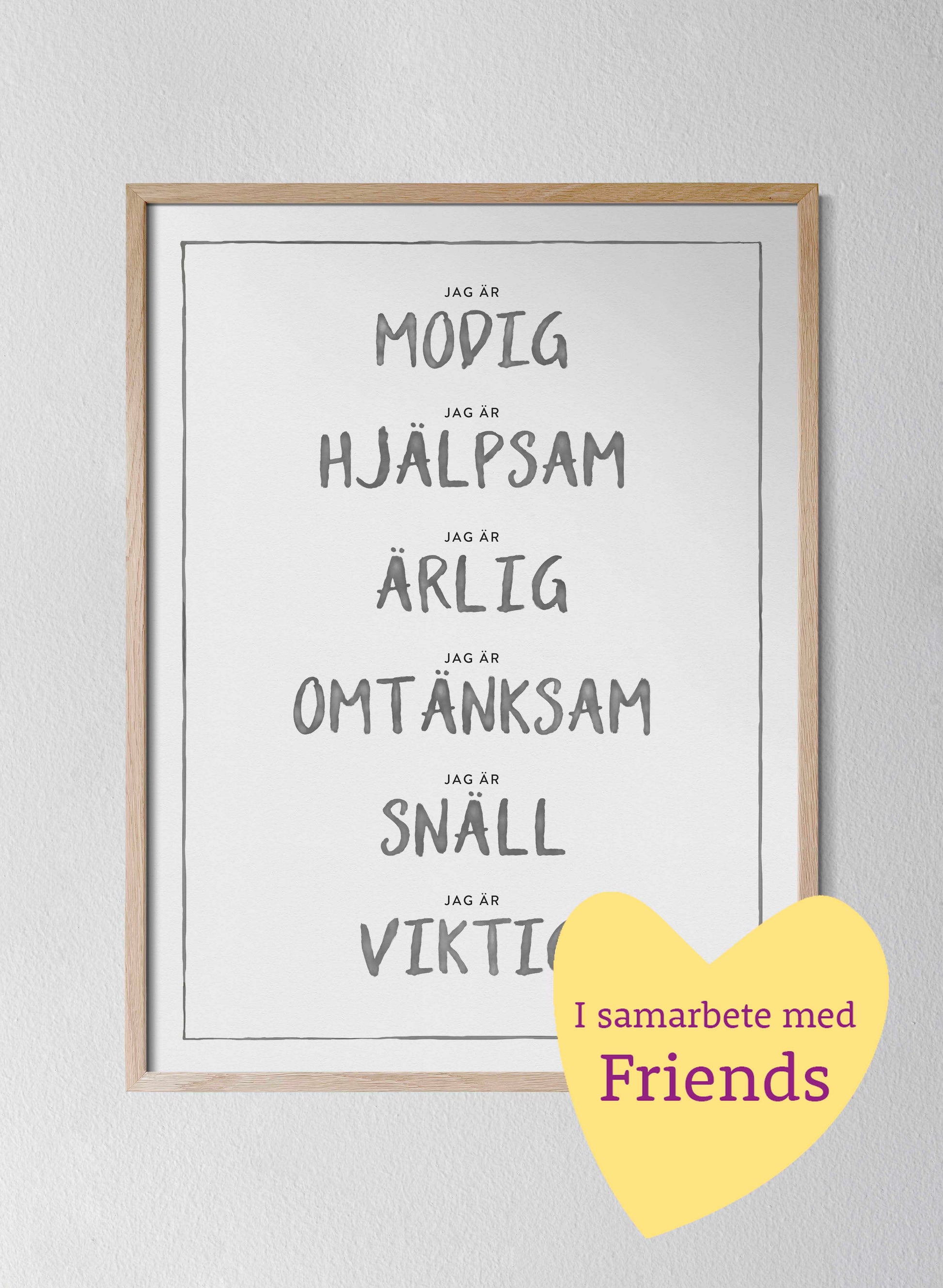 Hur är en bra kompis? Tillsammans med Friends har vi tagit fram tavlan "Jag är" med affirmationer som beskriver en bra kompis. Tavlan förmedlar de positiva egenskaperna som bygger en bra kompis. Med denna tavla vill vi boosta alla bra kompisar där ute, vi vill inspirera och påminna om dessa viktiga egenskaper. Häng upp tavlan i barnrummet som en daglig påminnelse om hur en bra kompis är.