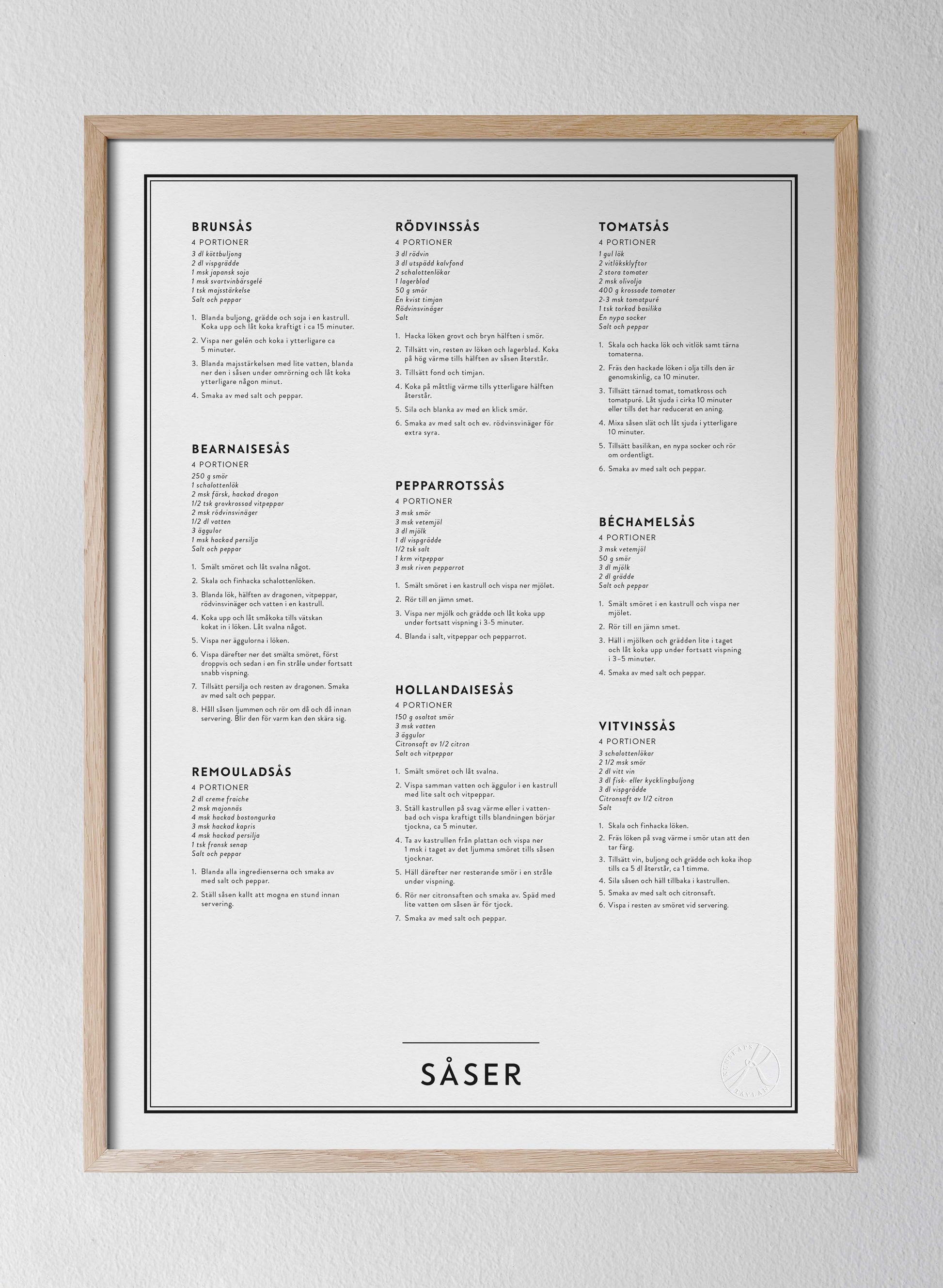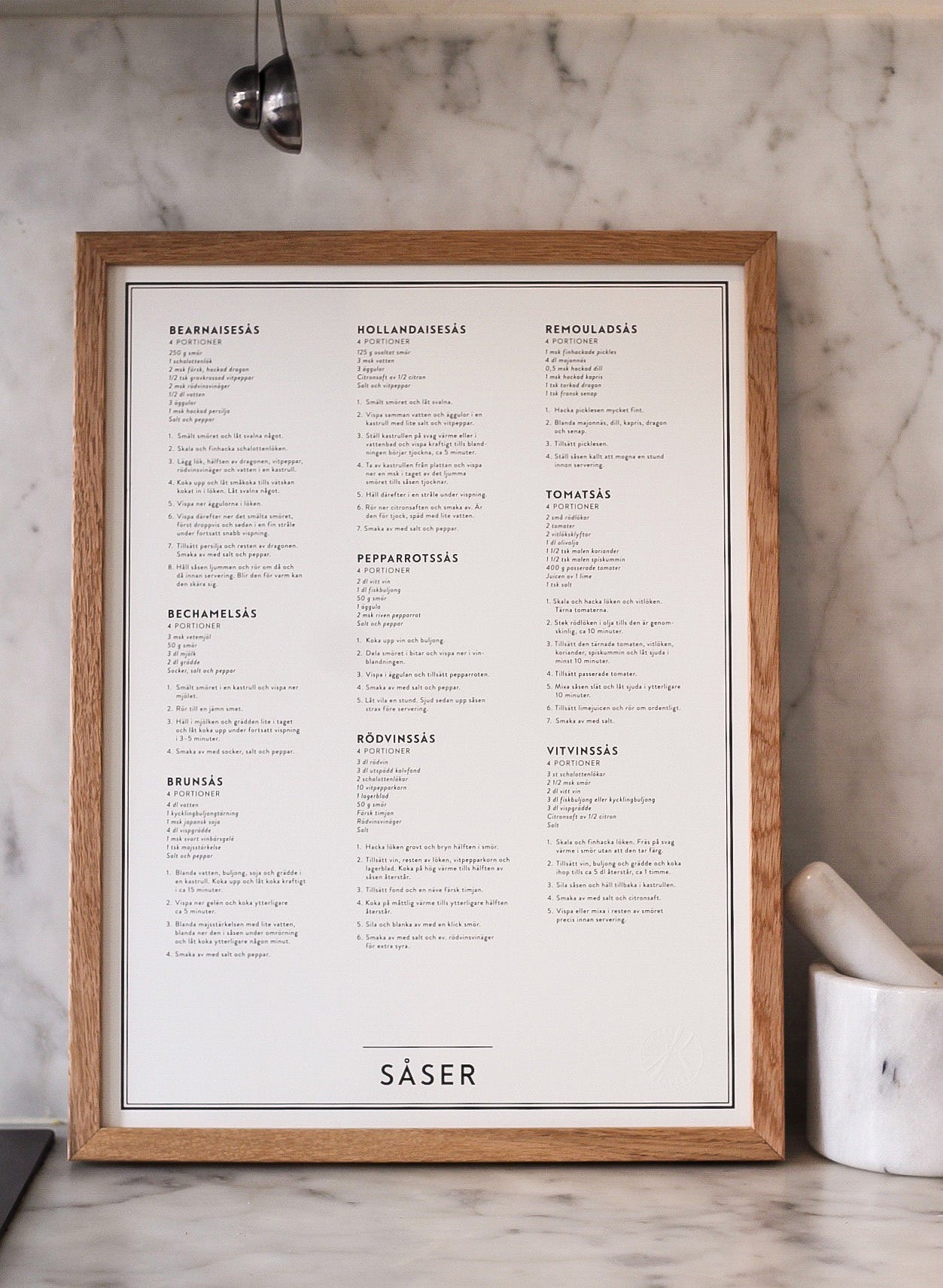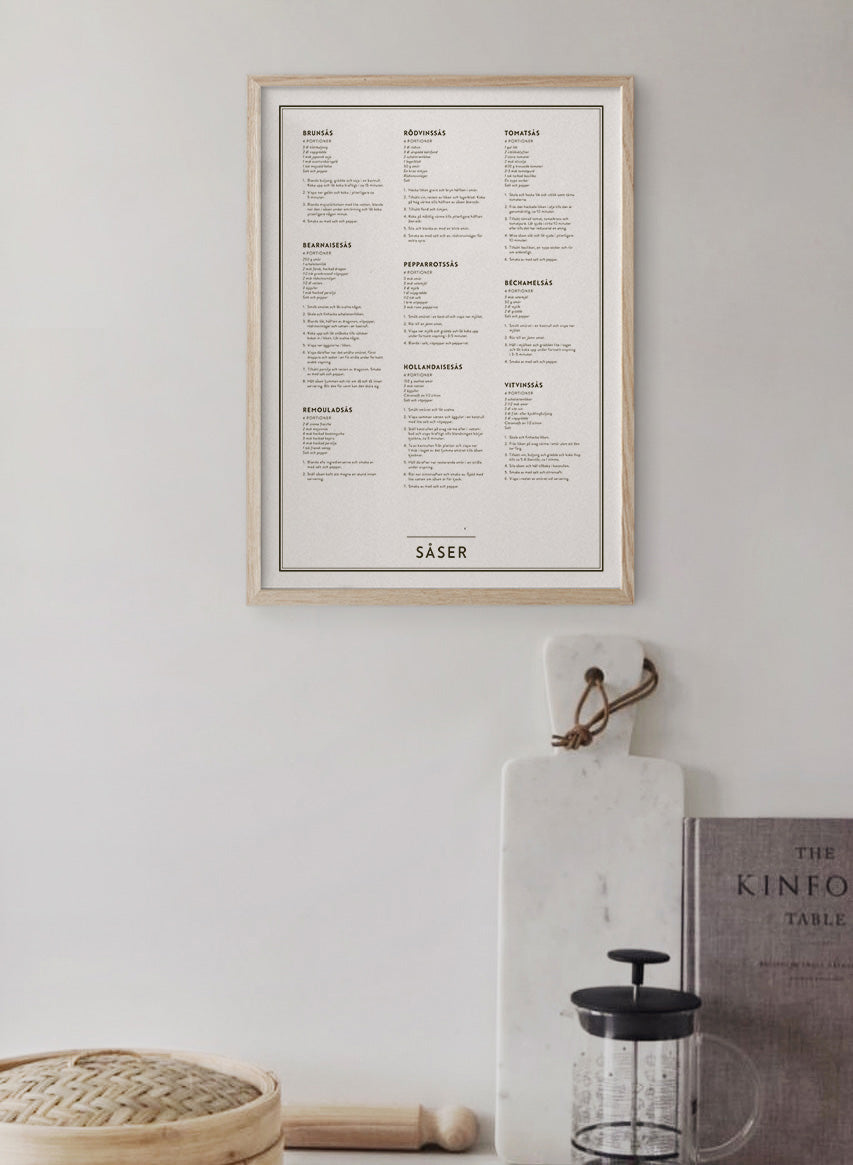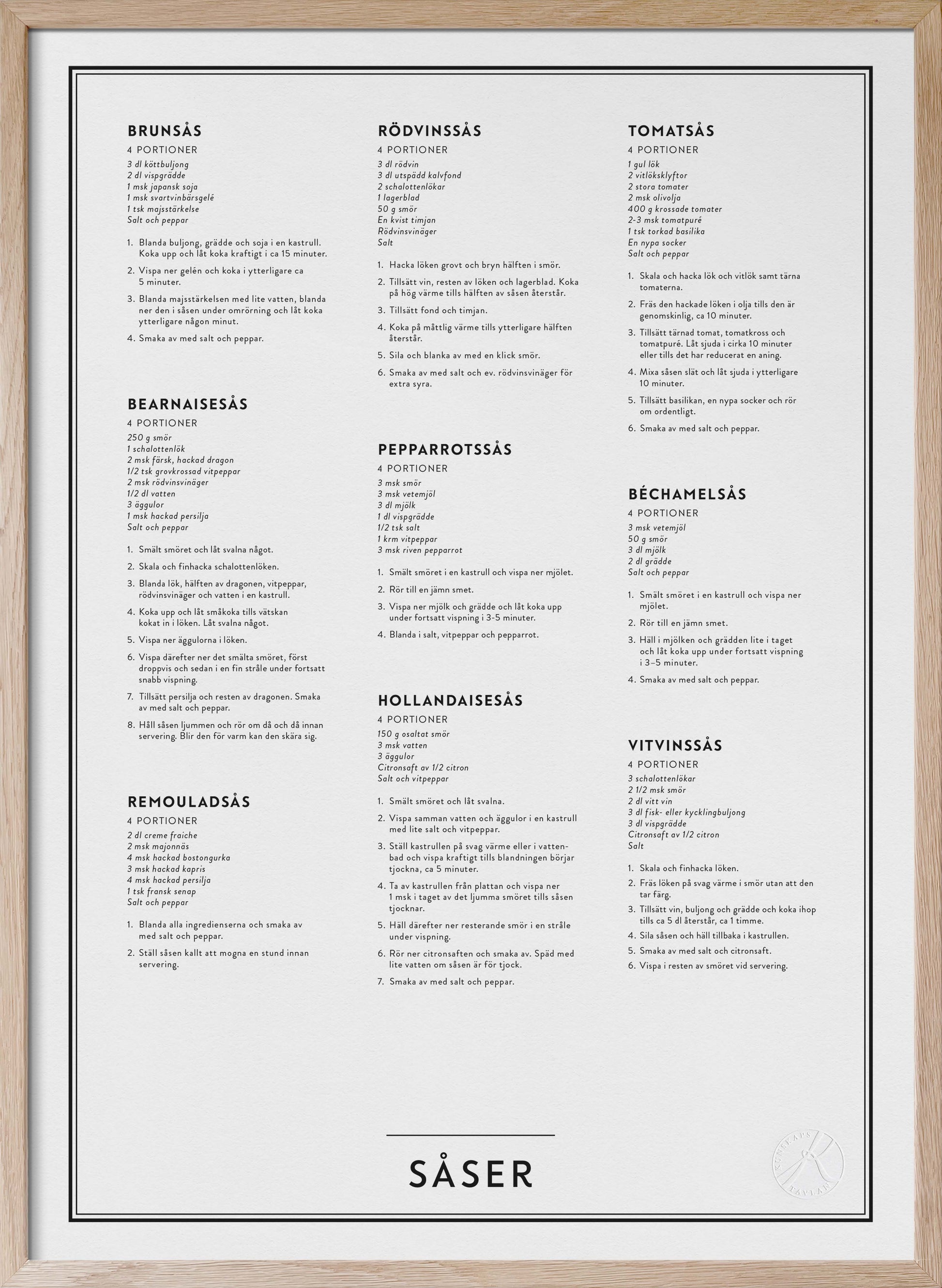 Tavla med recept över de viktigaste såserna. Poster med klassiska såsrecept som passar bra i köket. Här hittar du allt från rödvinssås till bechamelsås. Alla såserna man bör kunna.